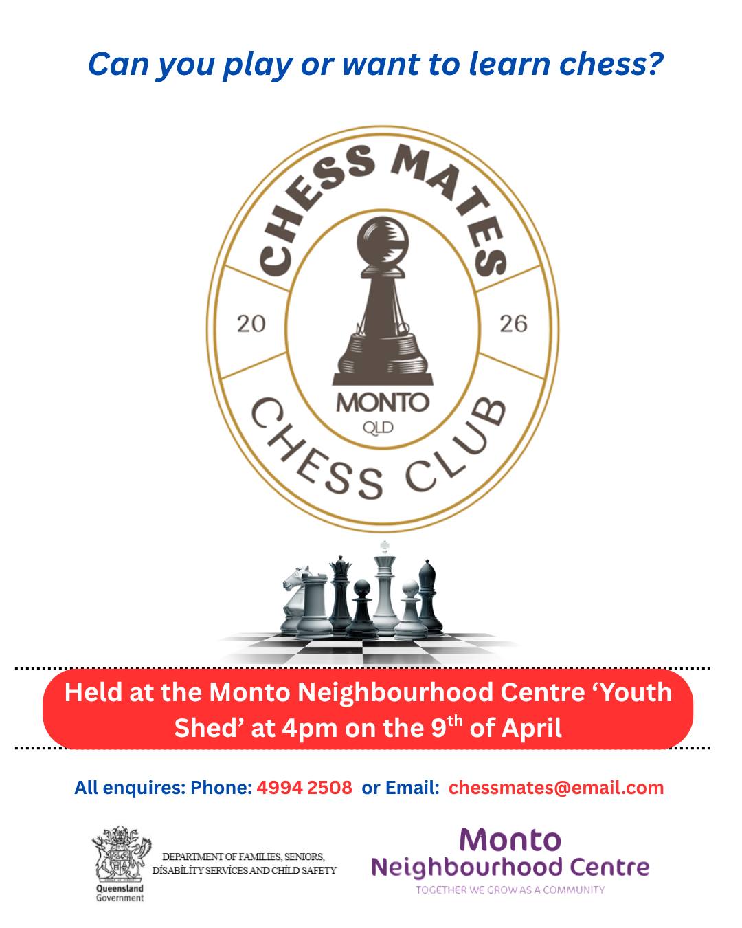Curious about chess or already know how to play? Come along for a friendly game, learn new strategies, and meet fellow players. Due to the Monto Coffee Lounge shutting early on the 9th, the first meeting this month will be held at the Monto Neighbourhood Centre Youth Shed at 4pm.