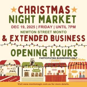 Monto Markets will be holding a twilight Christmas Market and participating businesses in Newton Street will be open until 7pm for all your Christmas shopping needs.