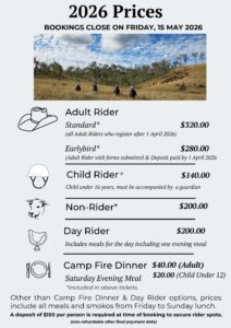 The ride on Saturday would be for about 20 kilometres with cattle and would depart after breakfast at approximately 7.30-8am returning around 3pm. Then we have a camp oven dinner for the evening meal which is quite social.