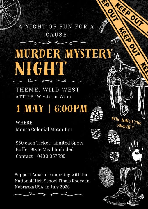 Wild West Murder Mystery!Who killed the Sheriff? When - Friday 1st May 6pmWhere - Monto Colonial Motor InnCost - $50 buffet style meal includedAttire - Wild West. Call 0400 057… Read More »Wild West Murder Mystery – Fundraiser