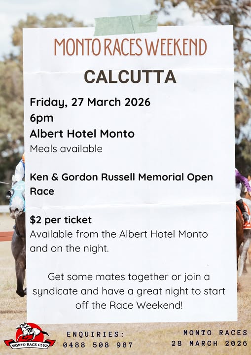 Kick-start your Monto Races weekend with us!Join us for the calcutta on the Gordon & Ken Russell Memorial Race on the Friday night before race day at the Albert Hotel Monto,… Read More »Culcutta for Gordon & Ken Russell Memorial Race