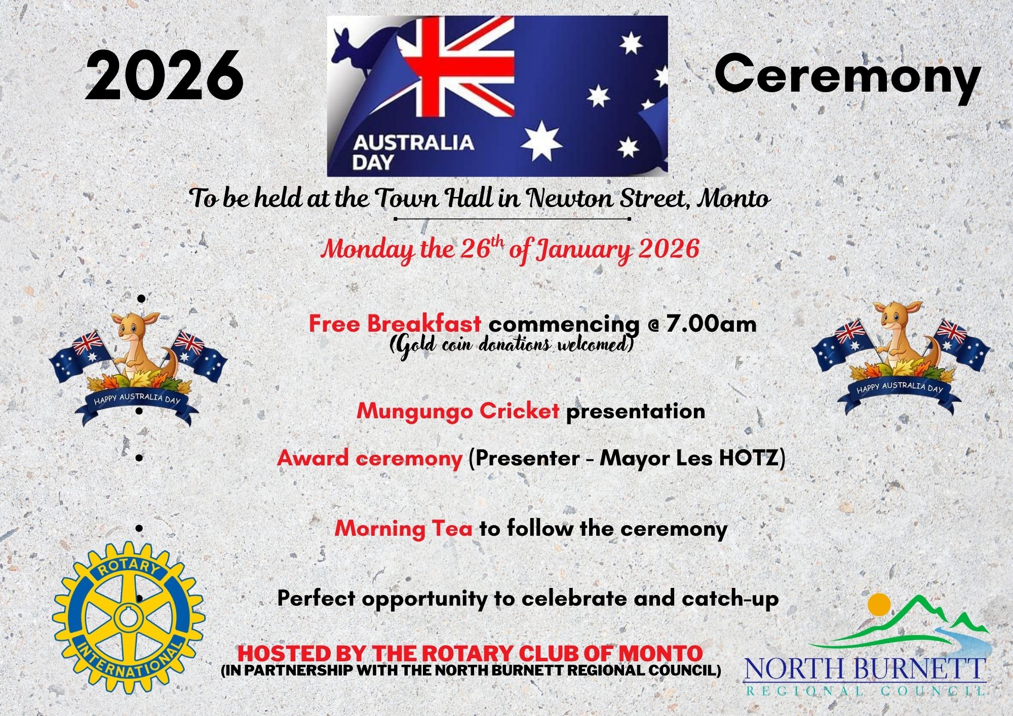 Australia Day in Monto Australia Day is a time to come together as a community, to reflect, respect and celebrate the people and stories that shape the North Burnett. Join us for a meaningful day of connection, recognition and community pride.North Burnett Regional Council sincerely thanks our community partners and volunteers for their collaboration in delivering… Read More »Australia Day |